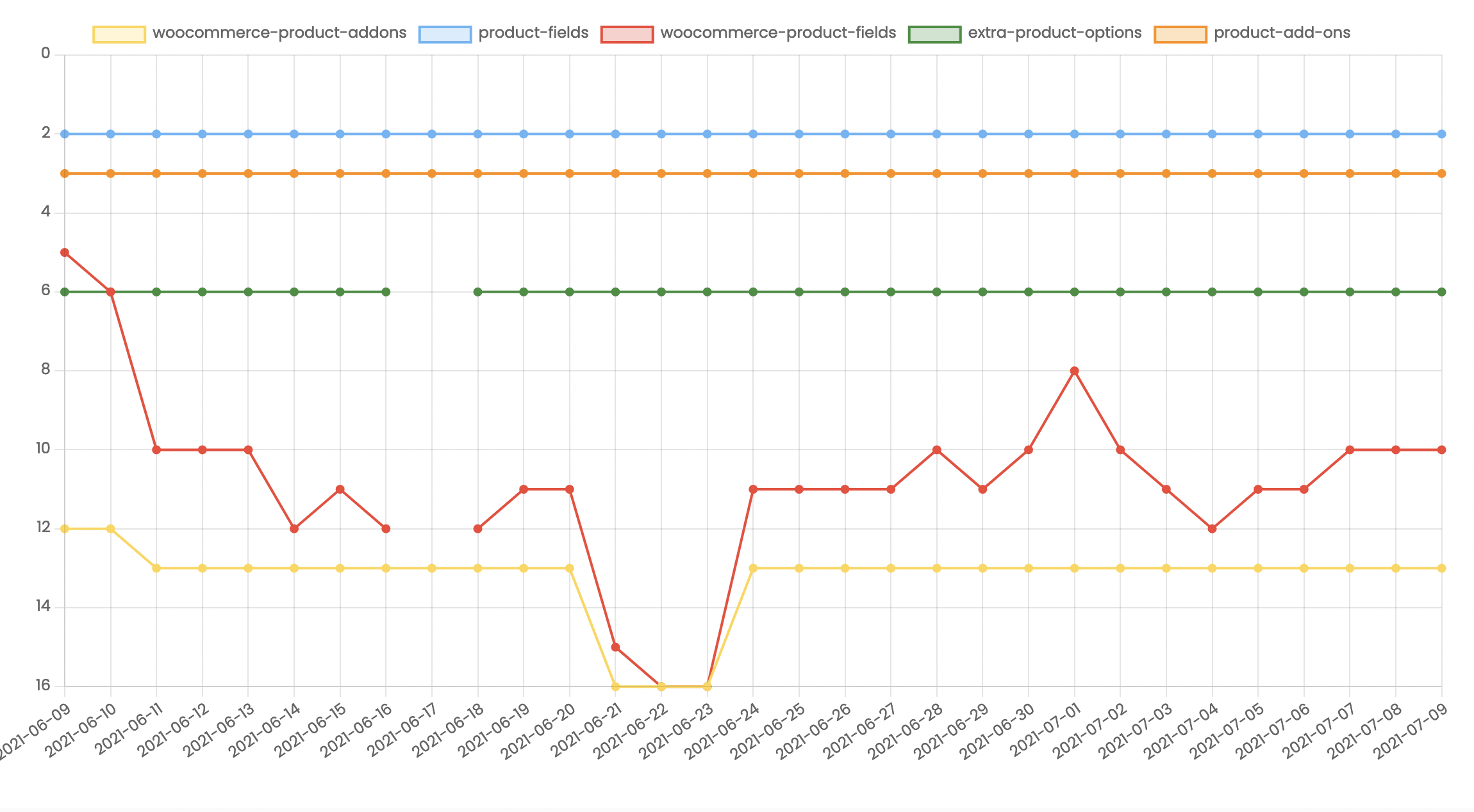 Za pomocą danych w tej zakładce jesteś w stanie sprawdzić, w jaki sposób radzi sobie w danym momencie konkurencja oraz czy teraz jest trend dla wtyczek z tej kategorii. W związku z tym, że wykresy posiadają bardzo dużo danych, każdy z wykresów posiada możliwość schowania danych konkretnej wtyczki.