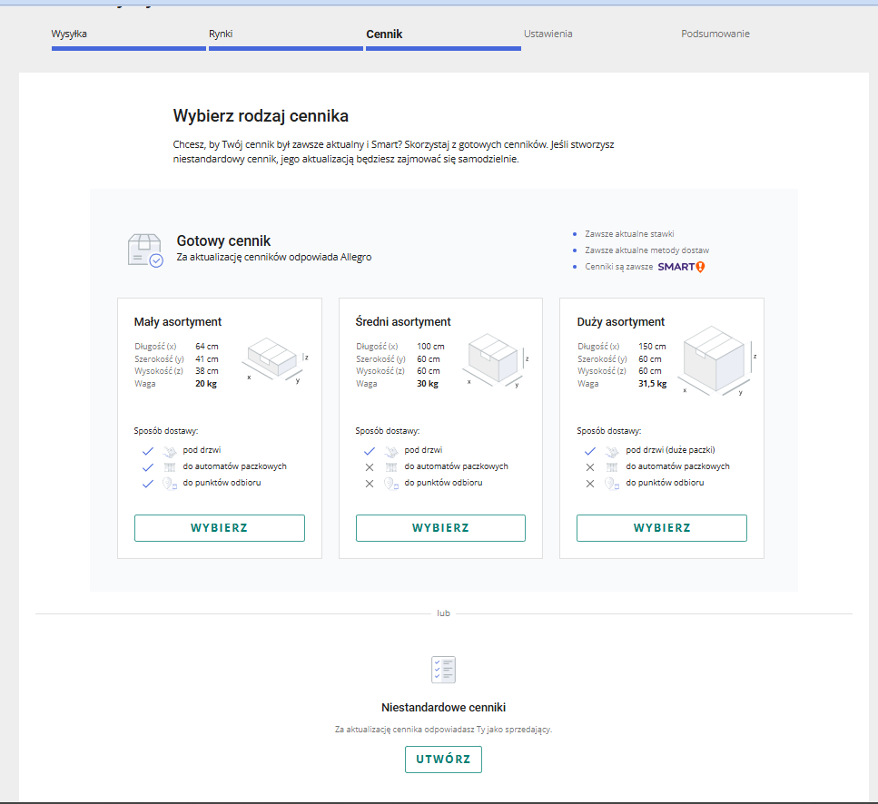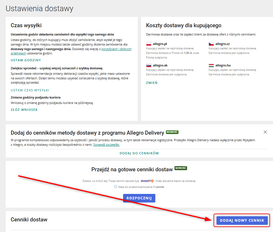 Cenniki dostaw stworzysz i skonfigurujesz po stronie systemu Allegro, po zalogowaniu na swoje konto. Przejdź pod ten adres i dodaj nowy cennik dostawy.