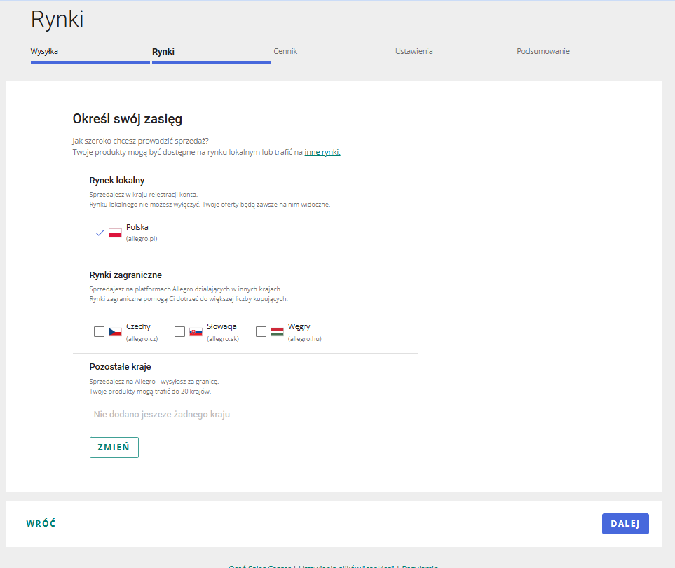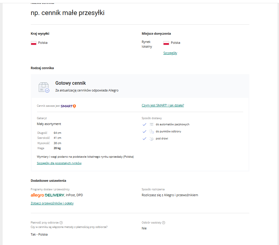 W ustawieniach cennika wybierz metody wysyłki, które chcesz udostępniać na aukcjach. Możesz ustawić szczegóły wysyłki ustawiając cenę dla pierwszej sztuki, oraz ograniczając liczbę przedmiotów w paczce.