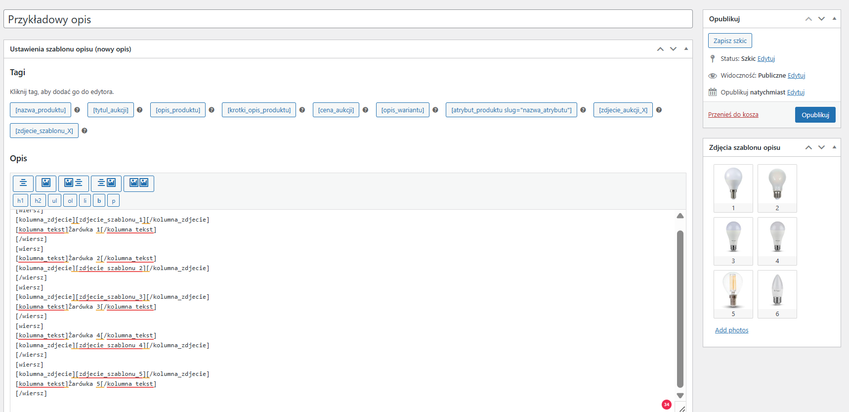 Do opisu aukcji możesz wykorzystać tagi na podstawie których w trakcie wystawiania aukcji zostanie pobrana właściwa treść.