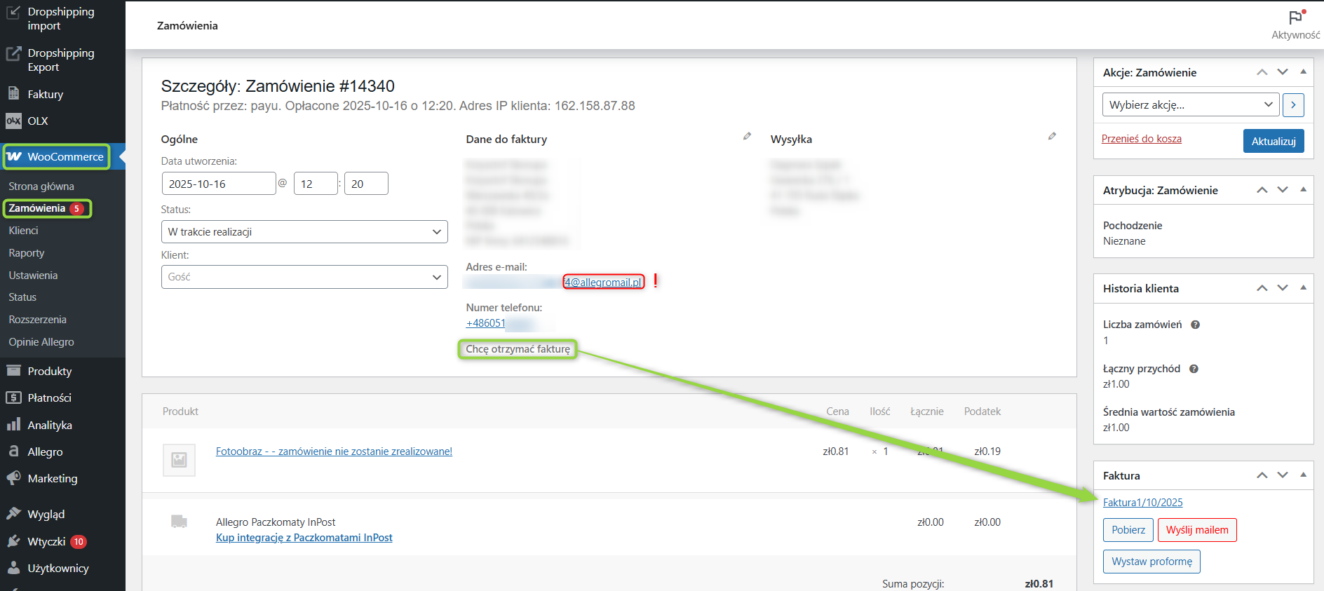- Zmiana statusu zamówienia w WooCommerce na W trakcie realizacji wywoła zmianę statusu zamówienia Allegro na W REALIZACJI