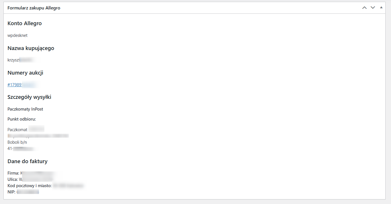 Jeśli kupujący na Allegro wybierze metodę wysyłki z oferty Poczty Polskiej, InPostu lub Orlen Paczka WooCommerce i jego zamówienie zostanie pobrane do WooCommerce, wtyczka wykryje metodę dostawy. Na ekranie edycji zamówienia pojawi się metabox umożliwiający szybkie nadanie przesyłki.