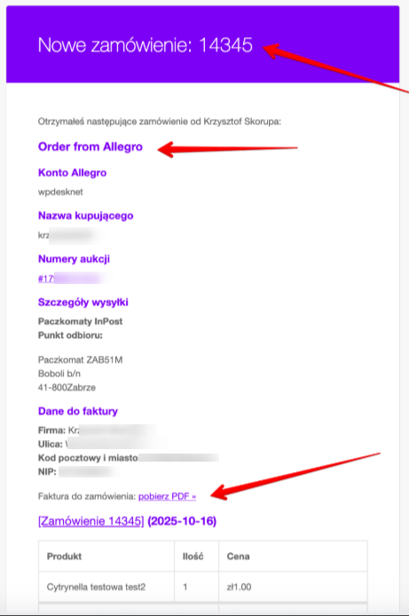 W edycji zamówienia dostępny jest “Formularz zakupowy Allegro”, który zawiera: