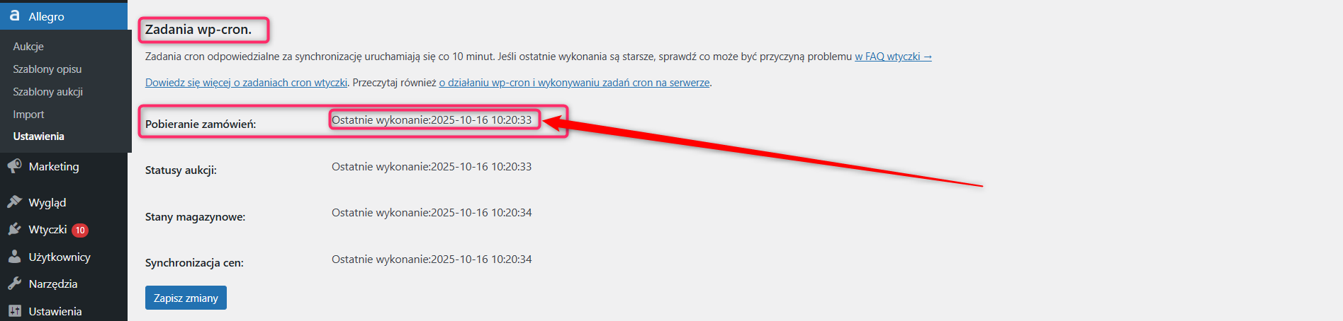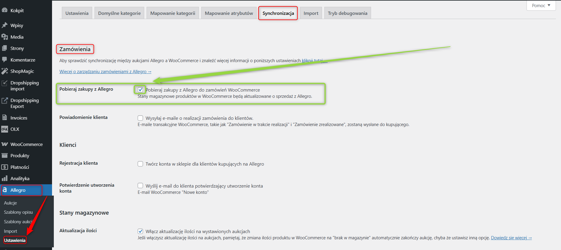 Zamówienia będą pobierane w momencie, kiedy we wtyczce będzie, włączona opcja Pobieraj zakupy z Allegro. Należy przejść do Allegro > Ustawienia > Synchronizacja gdzie znajdują się ustawienia dotyczące zamówień. Samo włączenie wspomnianej opcji nie wystarczy. Produkty muszą być również powiązane, tzn. wystawione z WooCommerce do Allegro w ramach wystawienia aukcji lub importowane z Allegro do WooCommerce za pomocą importu aukcji.