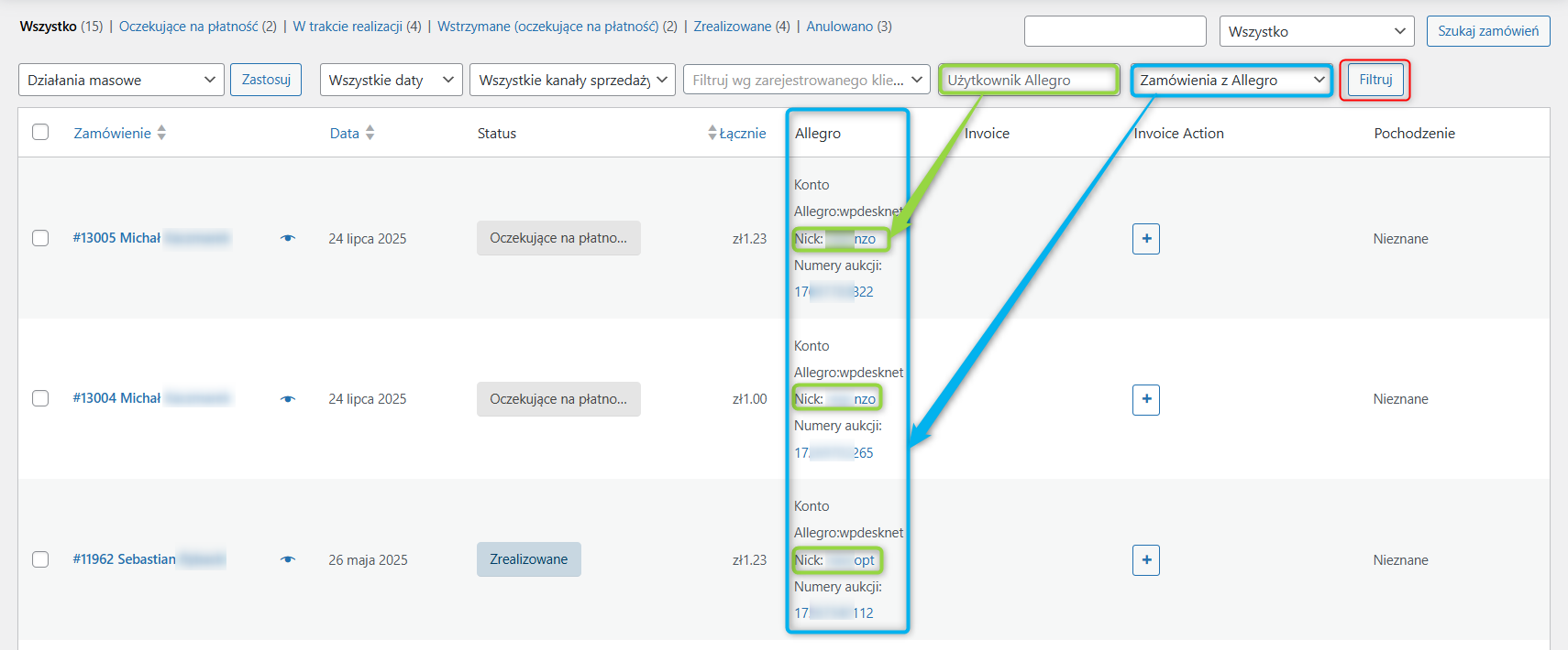 W kolumnie Allegro zobaczysz informacje o koncie Allegro, gdzie złożono zamówienie i nicku kupującego. Wyświetlą się też numery aukcji składające się na dane zamówienie.
