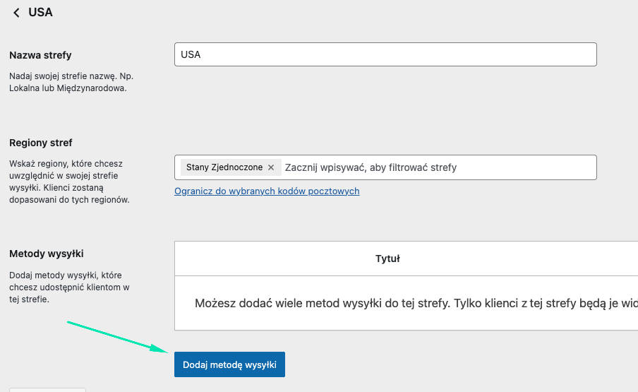 Zostaniesz przekierowany/-a do ekranu konfiguracyjnego strefy wysyłki. W jego dolnej części kliknij w przycisk Dodaj metodę wysyłki :