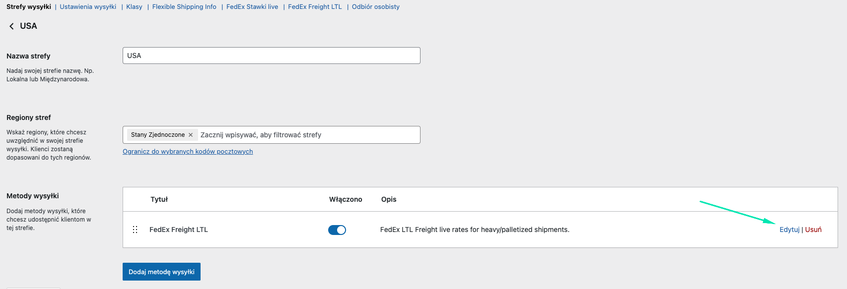 Jeżeli posiadasz już skonfigurowane strefy wysyłkowe, kliknij następnie w nazwę tej, w której chcesz dodać metodę wysyłki FedEx Stawki live.