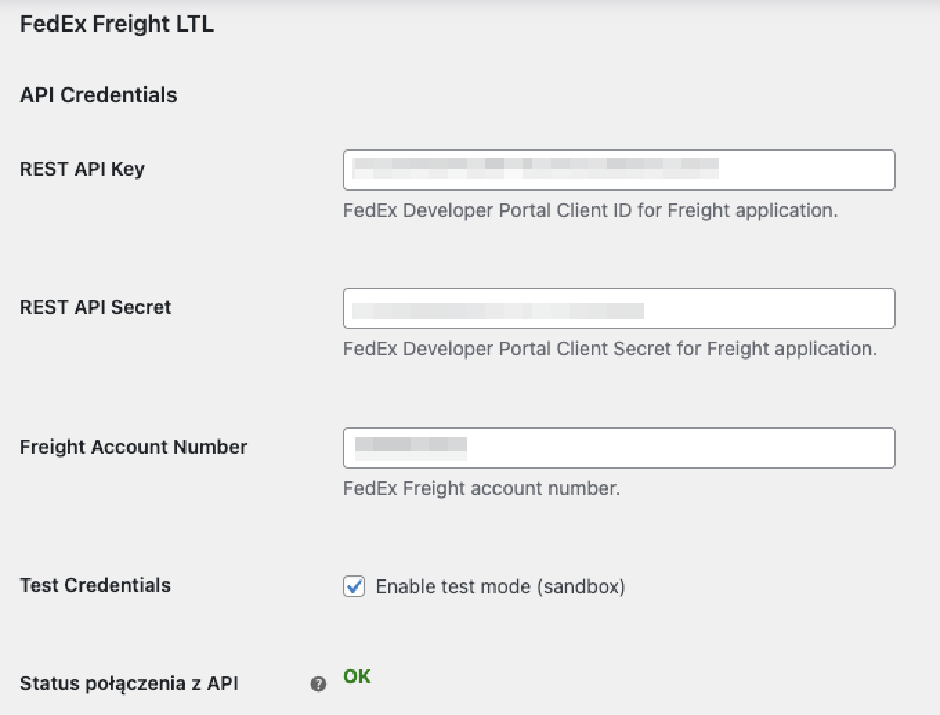Od wersji 5.0.0 FedEx WooCommerce w wersji PRO istnieje możliwość połączenia z usługą Freight. Przejdź do WooCommerce → Ustawienia → Wysyłka → FedEx Freight LTL. Aby wyświetlać klientom sklepu dostępne metody wysyłki FedEx Freight LTL, uwzględniające specyfikę składanego zamówienia i kupowanych produktów, uzupełnij poniższe pola danymi dostępowymi uzyskanymi w procesie tworzenia konta, tworzenia aplikacji i otrzymywania dostępu do REST API FedEx: