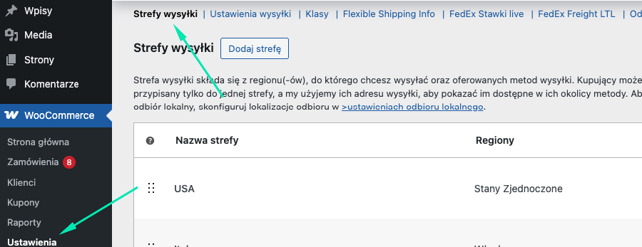 Aby dodać nową metodę FedEx Stawki live, wybierz z paska bocznego kolejno opcje WooCommerce → Ustawienia → Wysyłka: