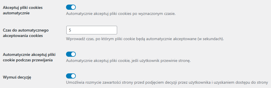• Czas do automatycznego akceptowania cookies – wprowadź czas, po którym pliki cookie będą automatycznie akceptowane (w sekundach).