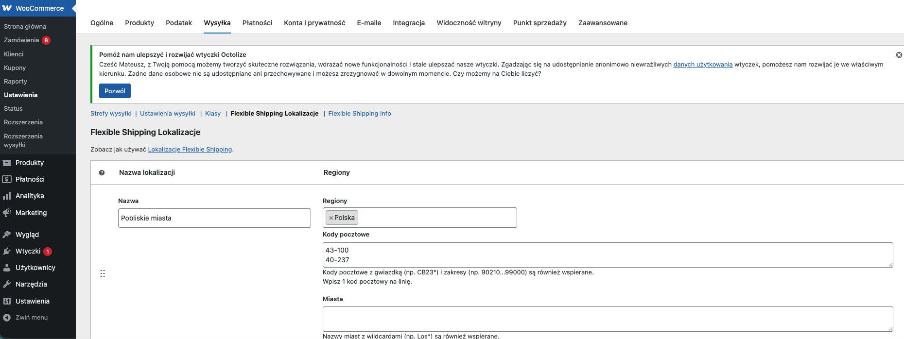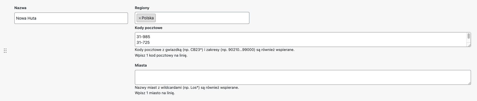 Kody pocztowe – dodaj kody pocztowe, aby stworzyć własne lokalizacje, np. województwa czy miasta, które nie są domyślnie w WooCommerce. Możesz użyć * (gwiazdki), np. 11* dla wszystkich kodów pocztowych zaczynających się od 11 lub … (trzech kropek) do stworzenia zakresu np. 00000…99999.