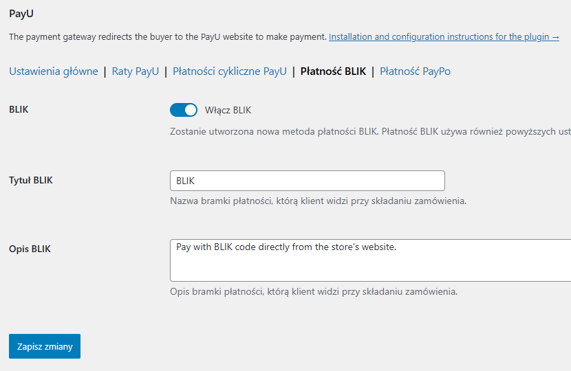 Zaznaczenie opcji Włącz Blik włączy nową metodę płatności w formularzu zamówienia Blik.