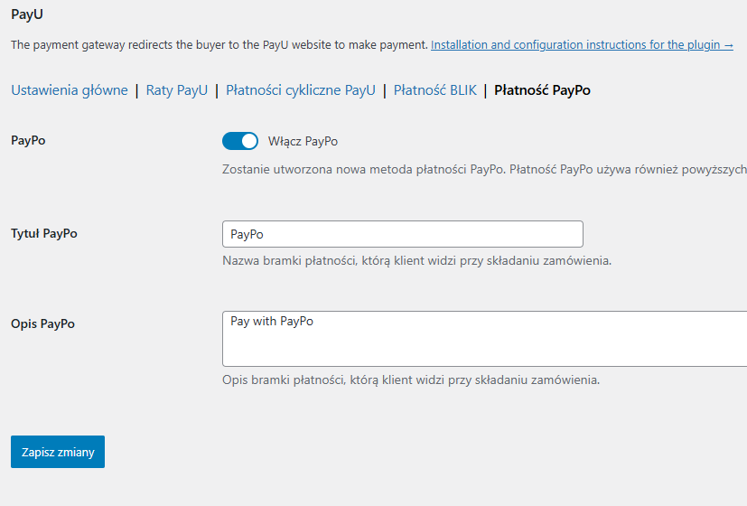 Zaznaczenie opcji Włącz PayPo włączy nową metodę płatności w formularzu zamówienia.