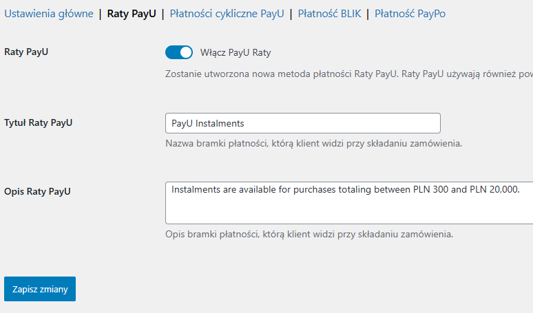 Zaznaczenie opcji PayU Raty Raty stworzy nową metodę płatności w formularzu zamówienia PayU Raty.
