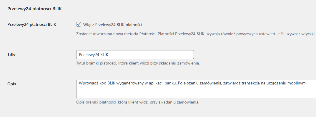 Przelewy24 Blik – zaznacz tę opcję jeśli chcesz, aby klienci Twojego sklepu mogli płacić za produkty z wykorzystaniem mechanizmu płatności Blik.