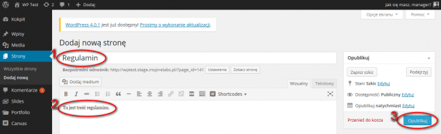 Na ekranie zobaczysz pola edycji, w które należy wpisać nazwę strony (w tym przypadku Regulamin) oraz treść. Po wprowadzeniu danych kliknij guzik Opublikuj.