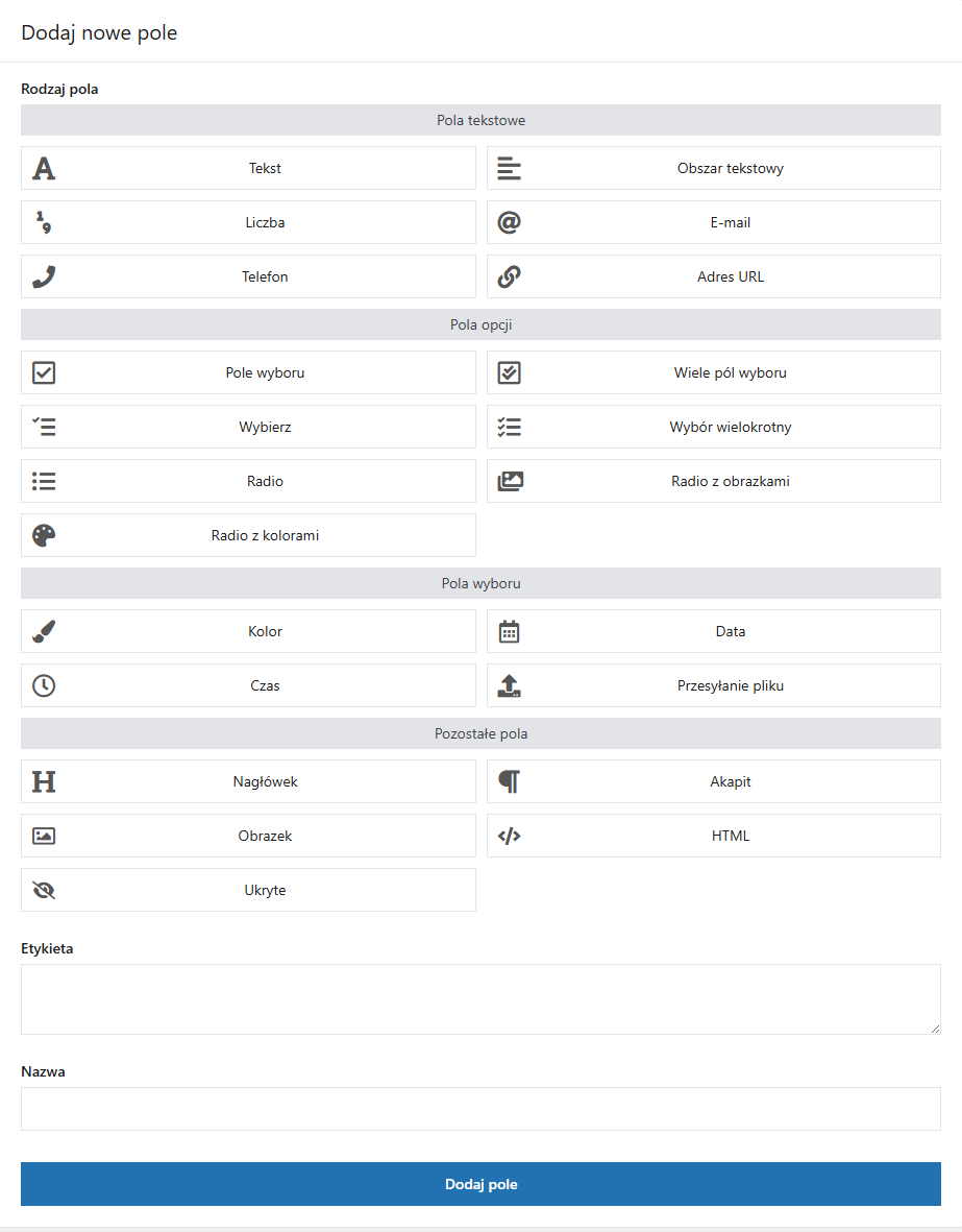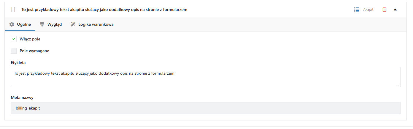 Etykieta – zmień etykietę pola. Możesz zastosować w treści HTML.