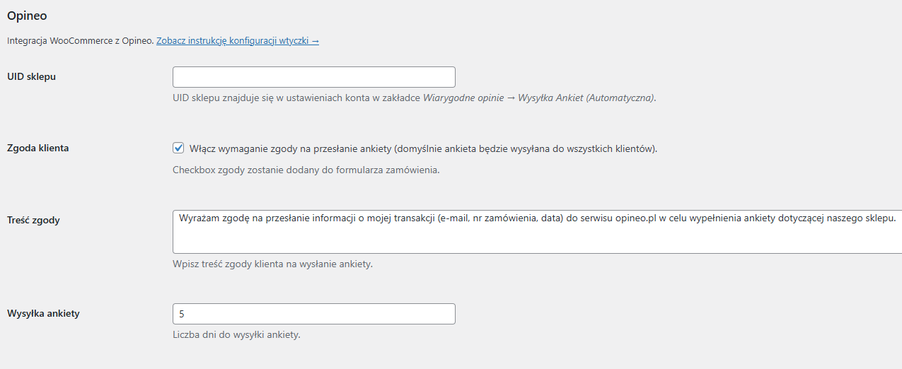 Przejdź do menu: WooCommerce → Ustawienia → Integracja → Opineo.