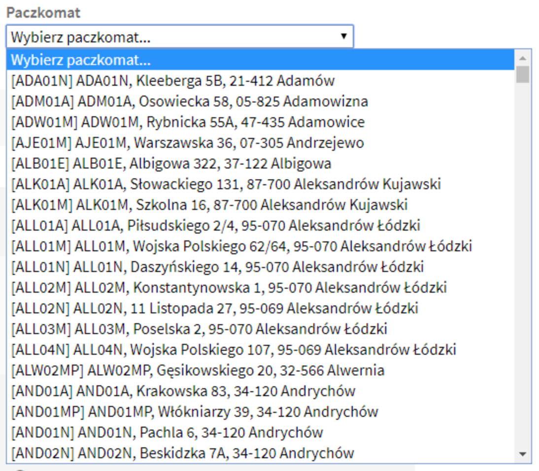 - Select – zwykła rozwijalna lista z możliwością wyboru paczkomatu ze spisu prawie 20 000 punktów odbioru: