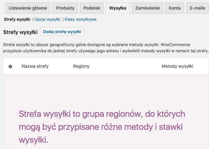 Strefy wysyłki to najważniejszy element wysyłki WooCommerce. To tutaj będziesz konfigurować wszystkie metody wysyłki, ale najpierw musisz dodać pierwszą strefę. Strefa wysyłki to grupa regionów, jak np. Europa, ale oczywiście może być to po prostu obszar całego kraju, czyli dla nas: Polska.