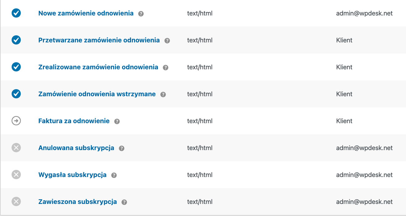 Wszystkie kluczowe e-maile dotyczące odnowień i statusów subskrypcji wysyłają się automatycznie.